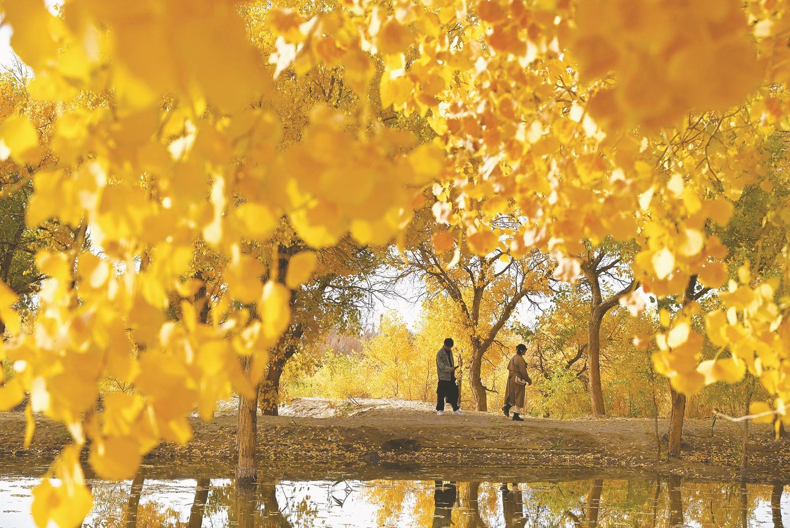 10月14日炒股配资平台网站,游客在甘肃省敦煌市黄渠镇的胡杨林中游览。金秋十月,甘肃敦煌多地胡杨林被秋色渲染,吸引游客前来赏景打卡拍照。